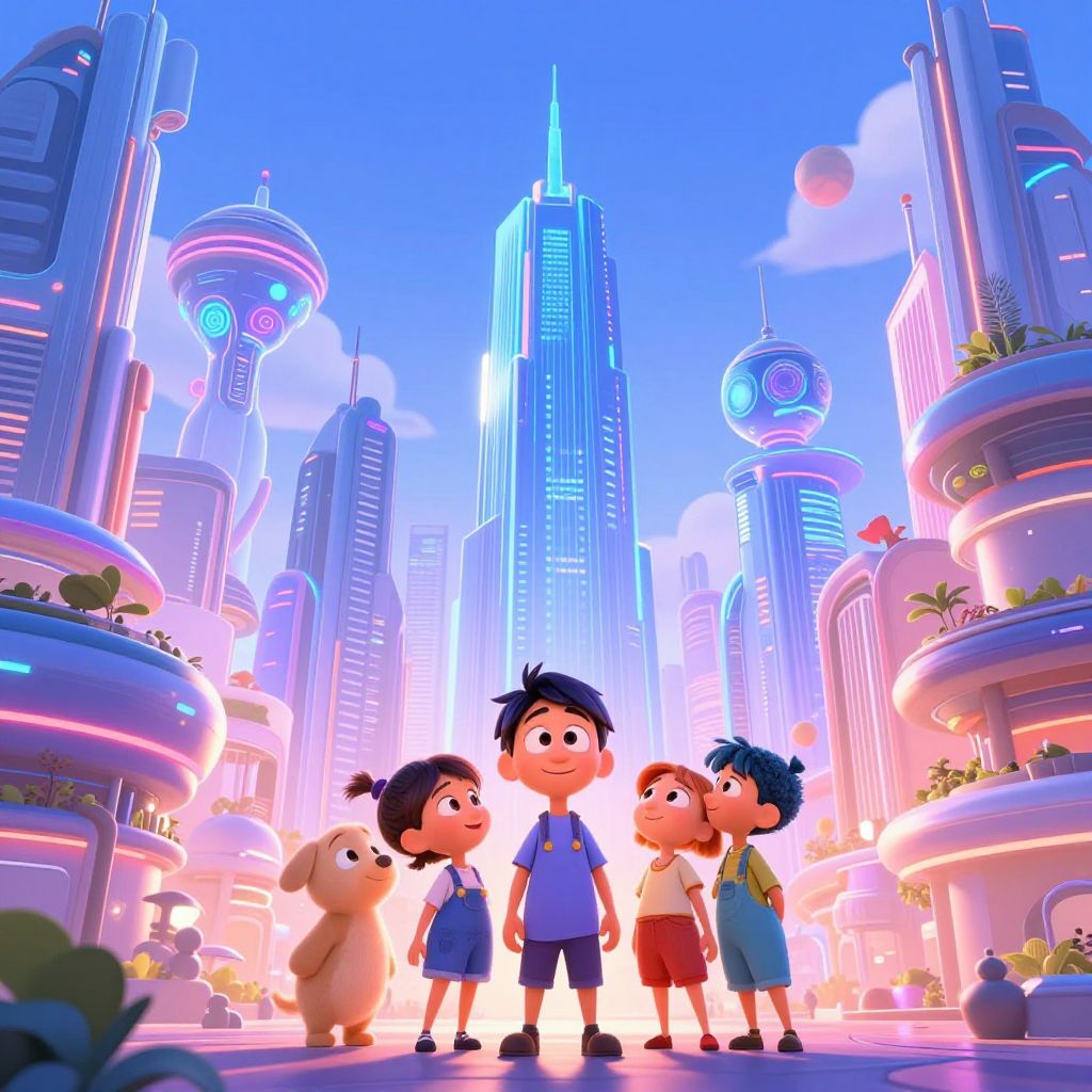 CGI image of four smiling children with cartoonish features, standing in a futuristic cityscape with neon-lit skyscrapers and floating gardens.