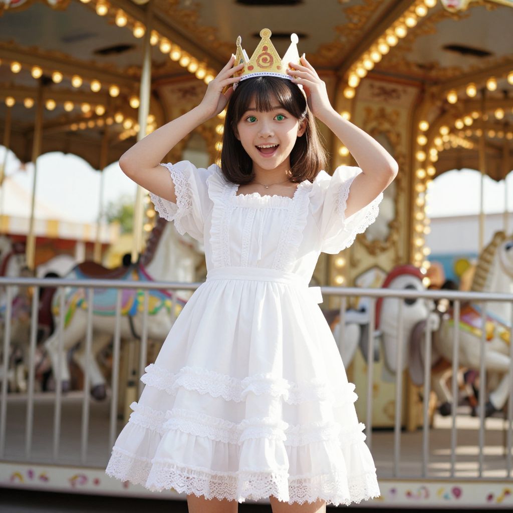 Photograph of a young Asian girl with straight black hair and green eyes, wearing a white, short-sleeved, lace-trimmed dress, and a gold crown. She stands in a brightly lit, ornate carousel with colorful, detailed horses in the background. The carousel is adorned with glowing lights, and the girl has a joyful, open-mouthed smile, holding the crown with both hands above her head. The image captures a cheerful, whimsical moment with a soft focus on the carousel, emphasizing the girl's delighted expression and the intricate details of the carousel's design.