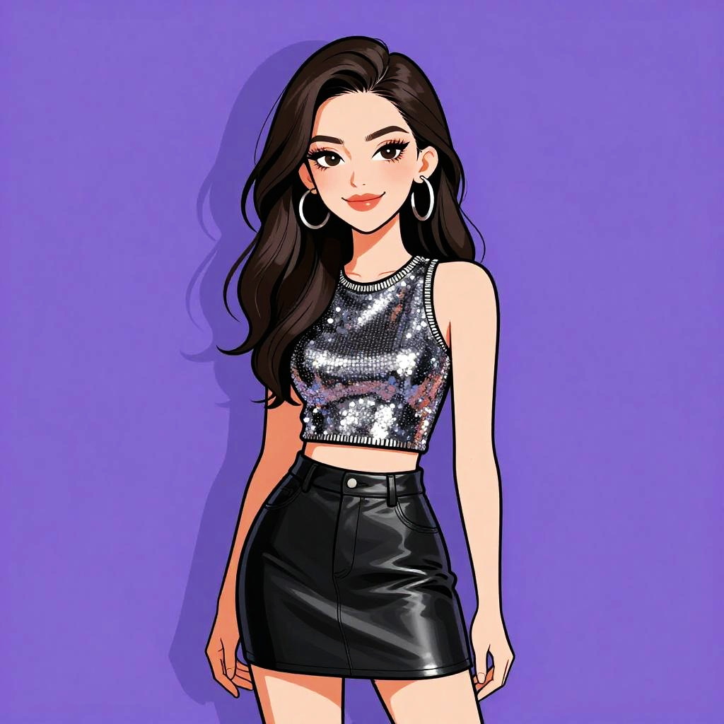 Woman with pretty face and pretty hair. smiling Woman, glam rock, metallic silver sleeveless top with sequins, crew neck, black faux leather skater skirt, mini-length. --sref 1467
