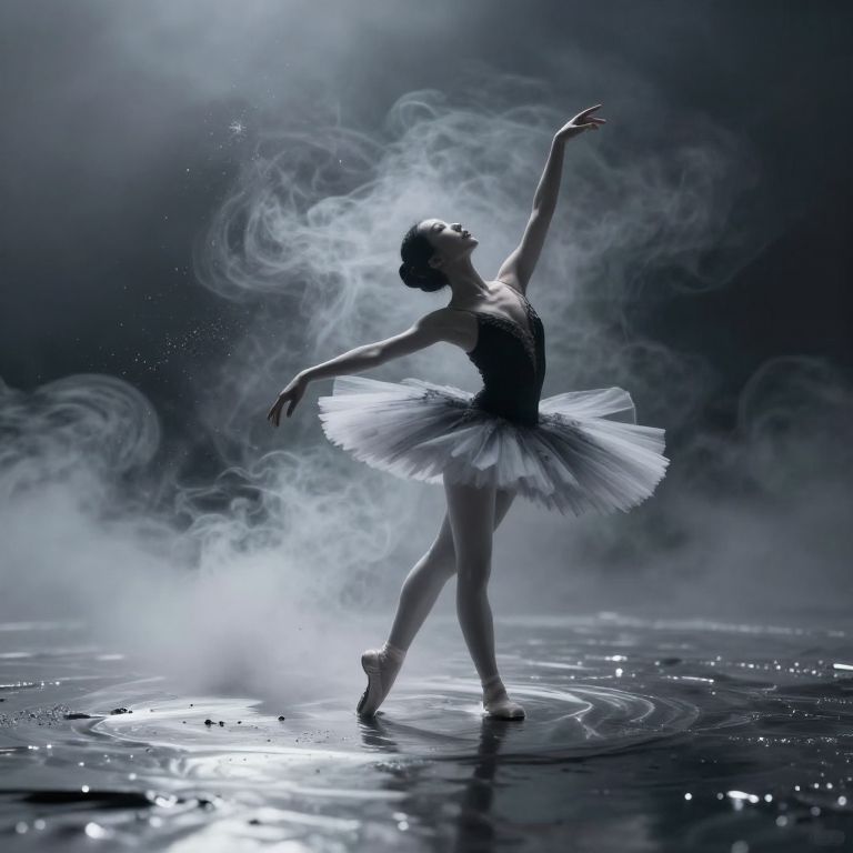 Photograph of a ballet dancer in mid-pose, standing on one leg in a shallow pool of water. She wears a black bodice with a white, translucent tutu and pointe shoes. Her arms are gracefully extended; one arm is raised above her head while the other is bent outward. Ethereal smoke swirls around her, illuminated by soft, bluish light, creating a mystical atmosphere. The background is dark, emphasizing the dancer and the glowing water droplets. The image has a dramatic, almost ethereal quality, highlighting the dancer's elegance and the fluidity of the tutu.