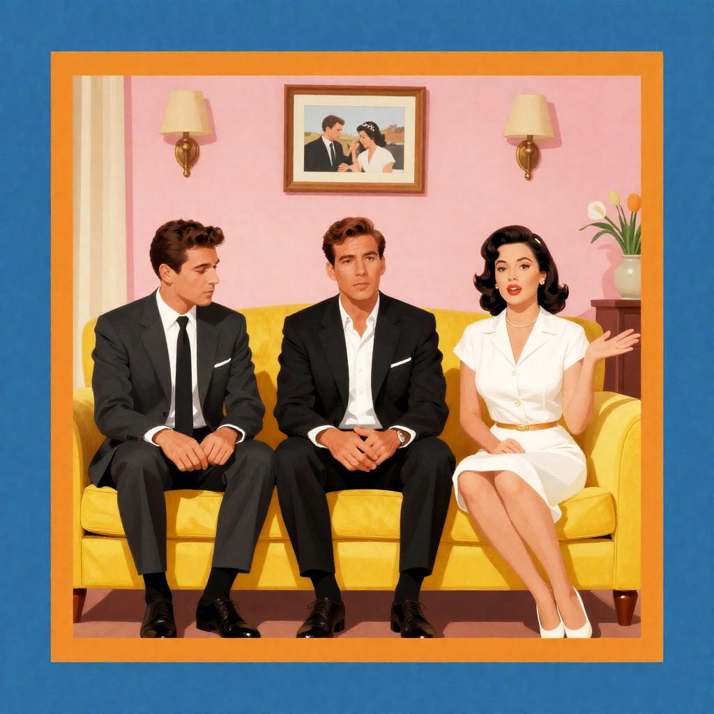 Movie poster with a 1950s style illustration. Three people on a yellow couch in a living room. Man on left with dark hair, black suit, looking down. Man in the middle with dark hair, black suit, looking forward. Woman on right with dark hair, white dress, gesturing with right hand. Background includes pink walls, framed photo, and wall sconces. Textured blue and orange border.