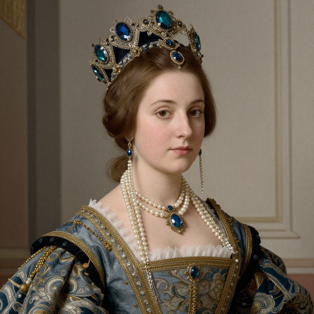 Photograph of a pale-skinned woman with brown hair, wearing an ornate blue and gold gown, pearl necklace, blue gemstone crown, and