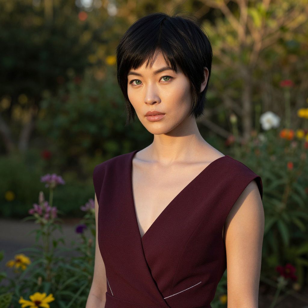 A photorealistic portrait captures an enigmatic East Asian woman with piercing green eyes and a sleek pixie cut in jet-black hair. Standing amidst a serene garden, her confident gaze rests off-camera, leaving viewers curious as to what has caught her attention. Golden hour light filters through lush foliage, casting soft shadows on her porcelain skin. Wearing an elegant deep burgundy jumpsuit adorned with subtle silver accents, she harmonizes seamlessly with the vibrant blooms surrounding her, creating a mesmerizing contrast that exudes both sophistication and tranquility. The close-up perspective hints at untold stories through her faint smile as she stands alone in nature's embrace.
