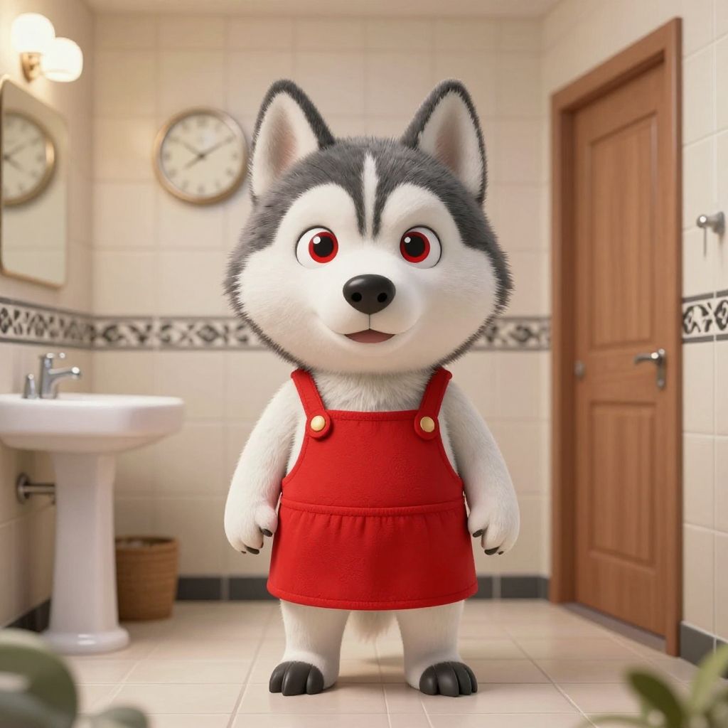 CGI image of a cute, cartoon-style, grey-and-white husky puppy with red overalls standing in a brightly lit bathroom.