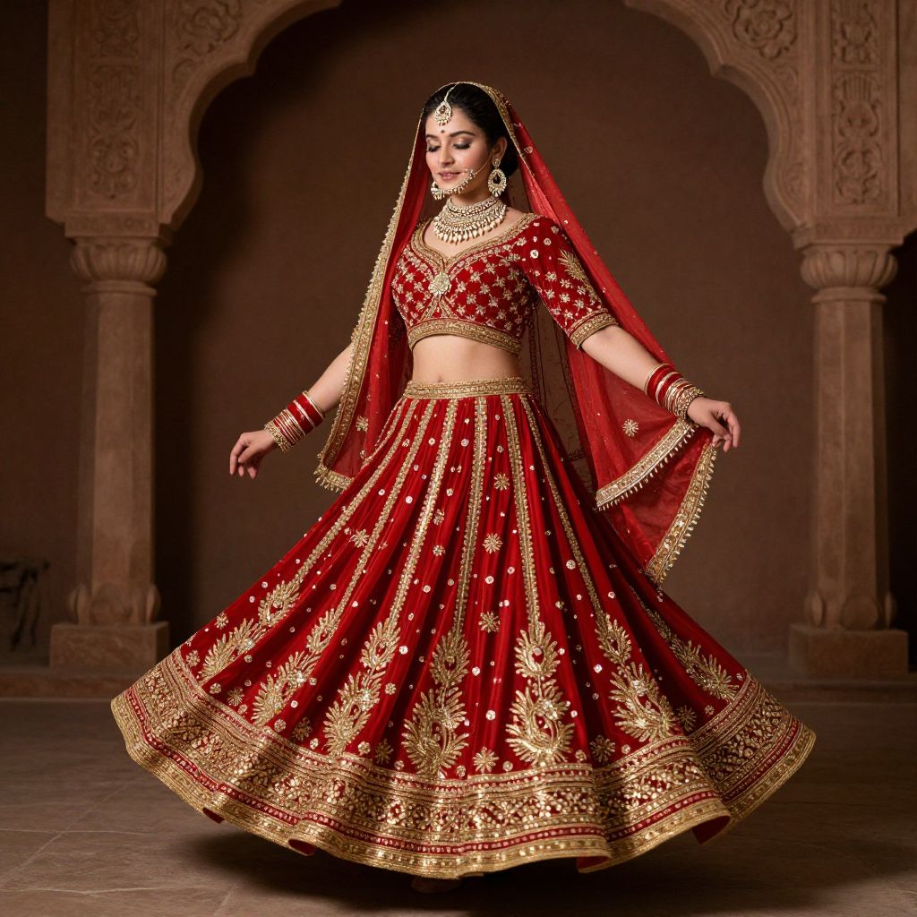 Ghoomar dance dress, a woman in a red and gold outfit with a red veil