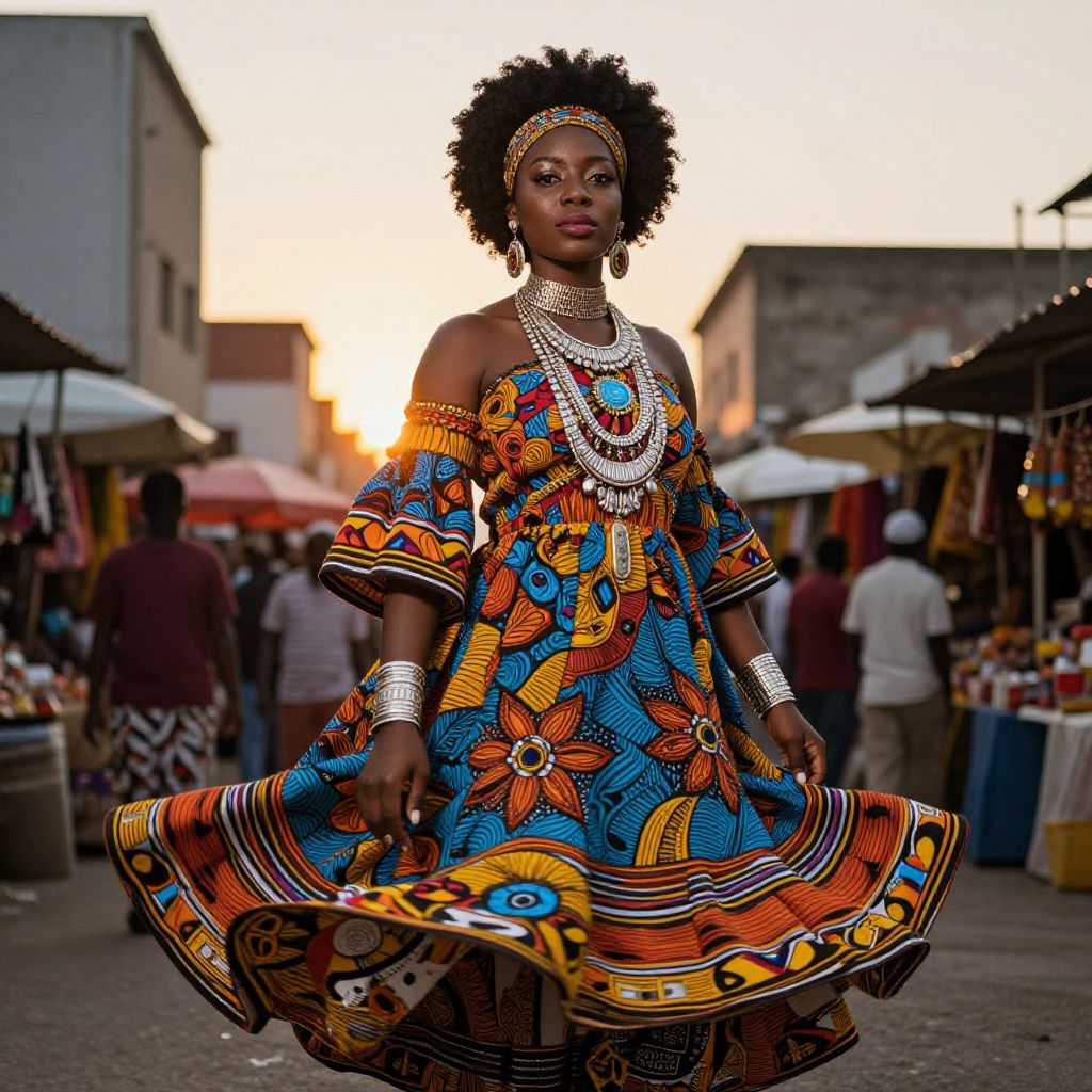 Photograph of a Black African woman with dark skin and a full afro, standing in a bustling outdoor market at sunset. She wears an off-the-shoulder, colorful, patterned dress with vibrant blue, orange, and red designs, and multiple layered silver necklaces. Her head is adorned with a matching headband. She stands confidently, holding the sides of her dress, which flares out. The background features blurred market stalls with various goods and people. The sun is setting, casting a warm, golden light that highlights her and her vibrant attire. The overall scene is lively and culturally rich.