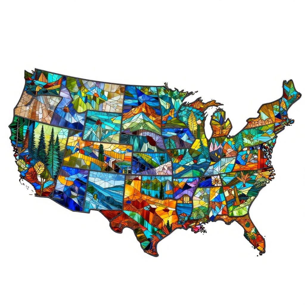 Alternate US map presented as a mosaic of colorful stained glass, each state a different vibrant pattern with natural elements like mountains, rivers, and forests, in a bright, artistic, abstract style with sharp lines.