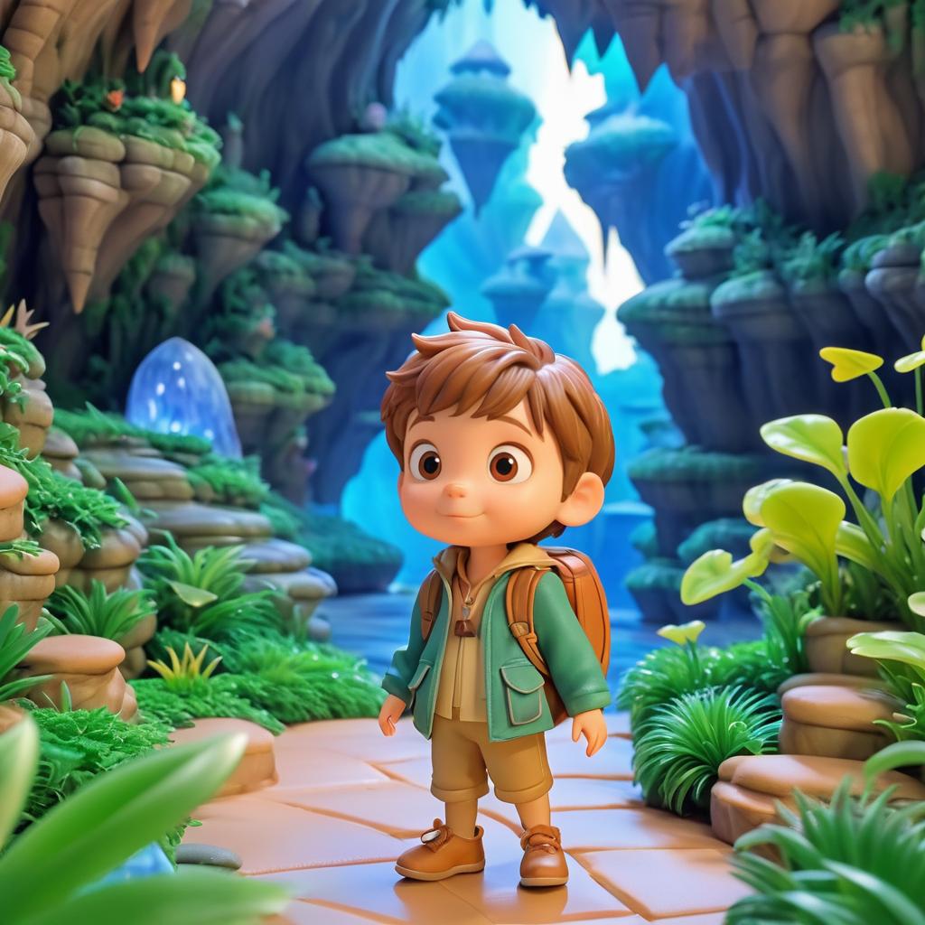 A little boy, traveling through the mystical cave, very brave, wearing a jacket, a map, and a mouse, very magical and beautiful plants, Disney animation scenes, clay wind, high-quality pictures, pop mart