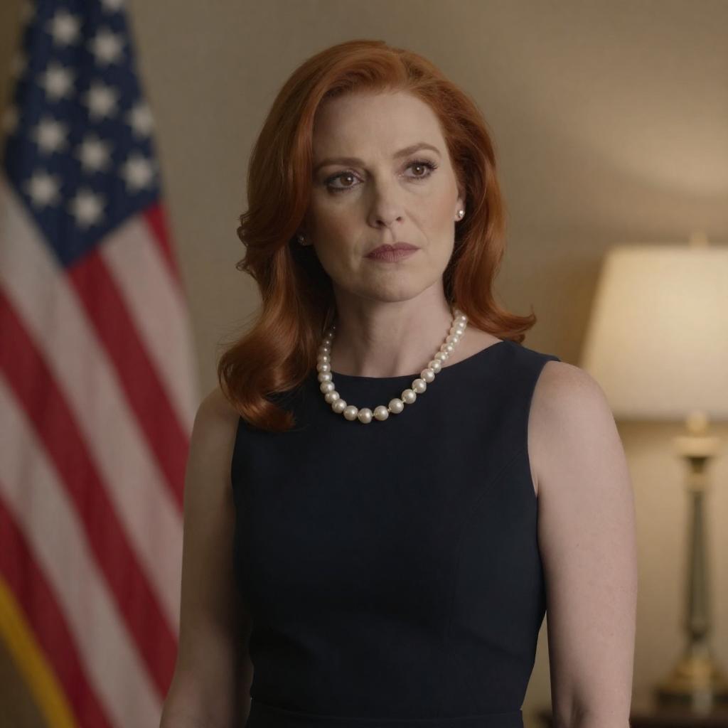 Photograph of a woman with shoulder-length red hair, wearing a black sleeveless dress and pearl necklace, looking to the side with a serious expression. Background includes a blurred American flag and a lit lamp. Warm lighting.