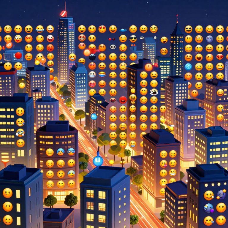 Pictures made with emojis forming a vibrant cityscape at night, bright colorful emoji icons creating buildings, streets, and glowing windows, playful and digital art style, detailed and lively atmosphere, 3D emoji mosaic effect