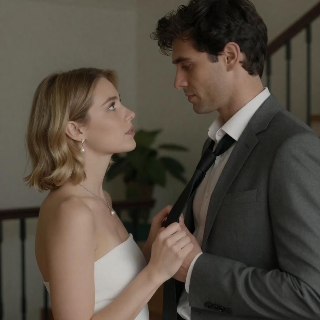 Close-up photograph of a man and woman with intense expressions, facing each other. Man has short brown hair, smiling, light skin. Woman has long blonde hair, pink headband, light skin, looking down. Dimly lit background.