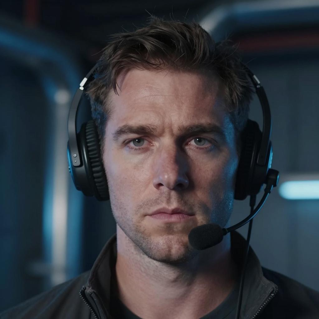 Close-up photograph of a serious-looking man with short, dark brown hair, wearing a headset with a microphone, in a dimly lit, blue-lit industrial setting. He has light skin, strong jawline, and is wearing a dark jacket with a visible collar. Background includes metallic pipes and blue lights.