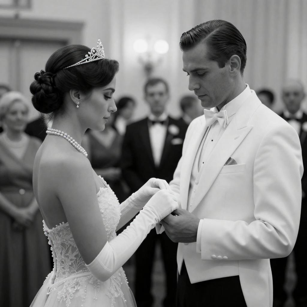 Black-and-white photograph of a formal event. A man with slicked-back hair, wearing a white tuxedo with a bow tie, adjusts the gloves of a woman with an updo hairstyle, wearing a tiara, pearl necklace, and white gown with lace details. Both are focused on each other, with blurred attendees in the background.