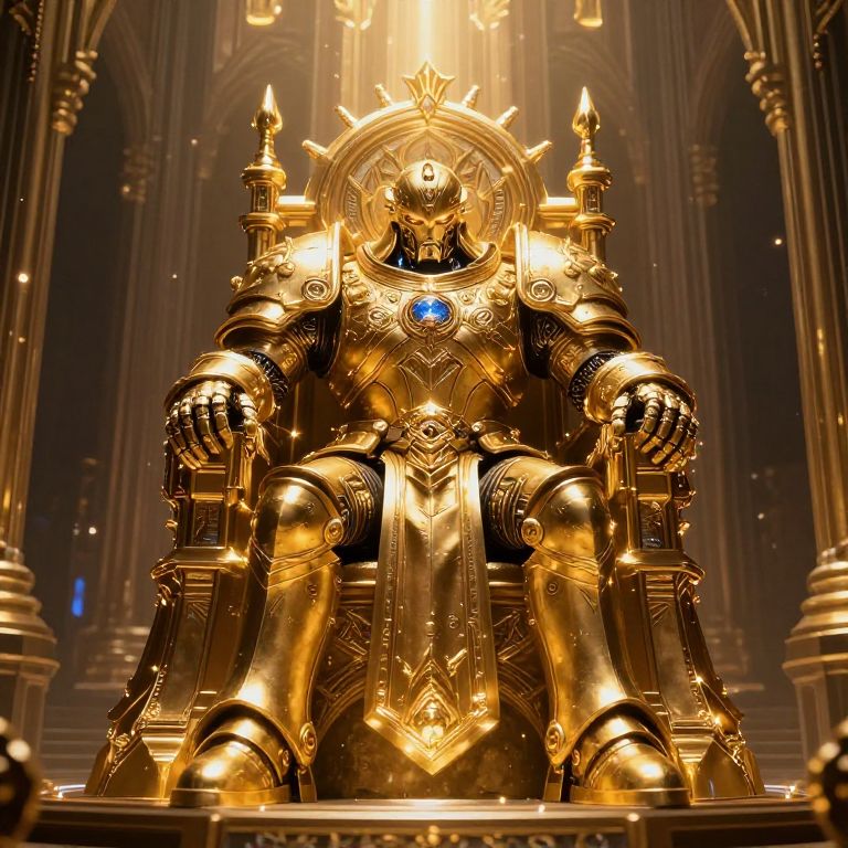 Photorealistic CGI of a regal, golden, armored figure with a blue gem on chest, seated on an ornate, throne-like chair in