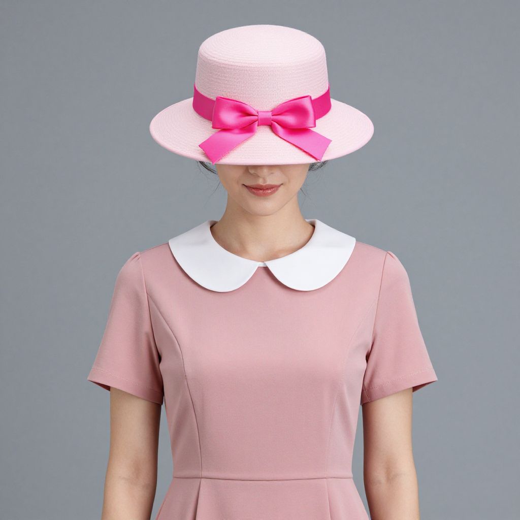 A woman is wearing a pink dress with a white collar and a pink hat with a pink bow.