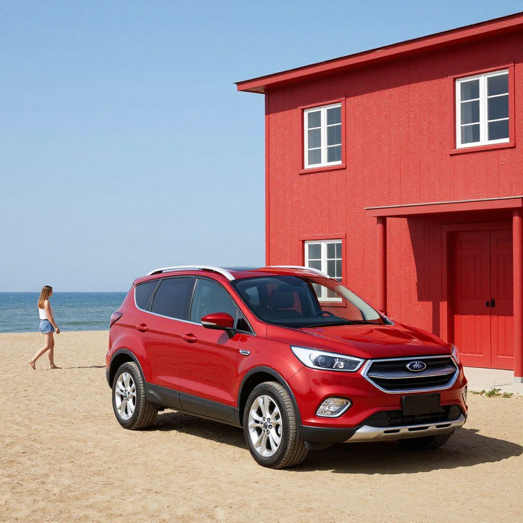 Photograph of a bright red Ford SUV parked on a sandy beach in front of a two-story, red wooden house with white-trimmed windows. A young woman with long brown hair, wearing a white tank top and blue shorts, walks towards the left, near the ocean in the background. The SUV has black trim and silver alloy wheels. The clear blue sky and calm sea add to the vibrant, summery atmosphere. The house has a closed, red garage door on the right.