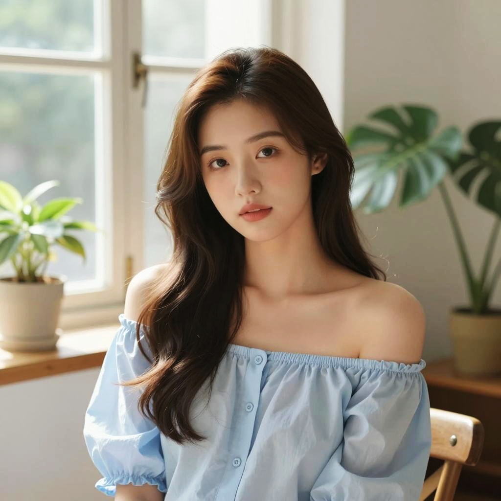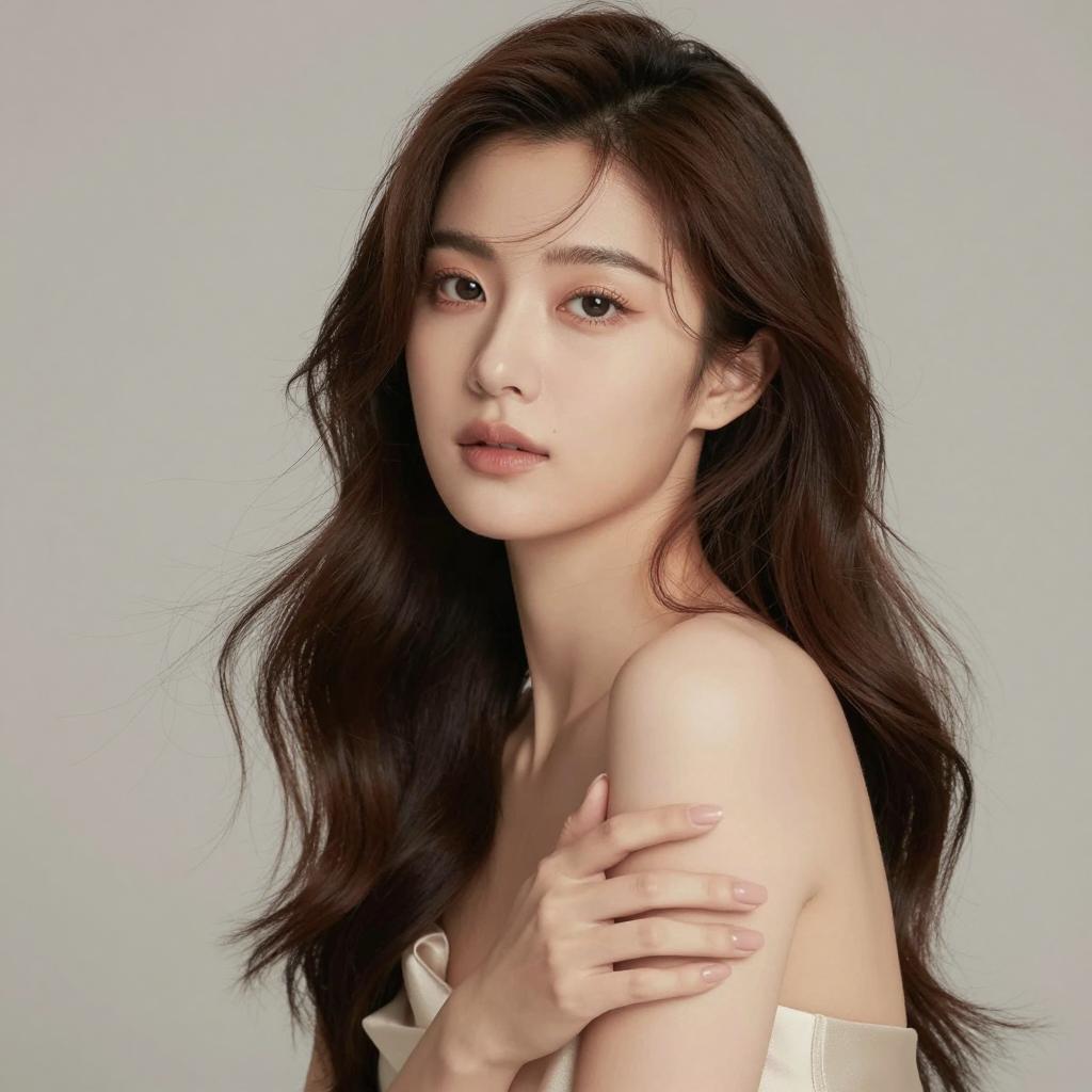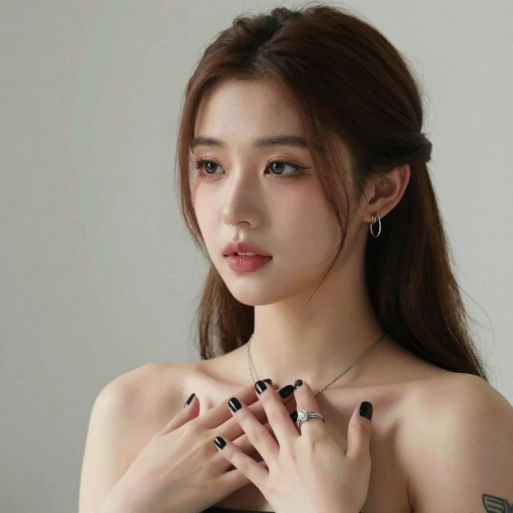 Asuna, asuna_\(sao\), 1girl, bare_shoulders, black_nails, collarbone, commentary, dark, earrings, fantasy, hair_between_eyes, highres, jewelry, looking_away, looking_to_the_side, nail_polish, necklace, off_shoulder, original, parted_lips, realistic, ring, ringlets, scenery, simple_background, solo, tattoo, upper_body