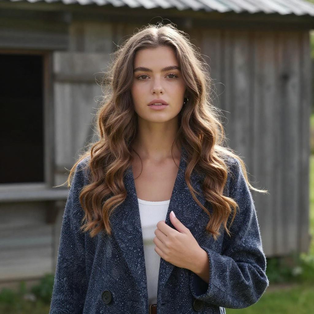 Photograph of a young woman with long, wavy, light brown hair standing in a rustic, outdoor setting. She's wearing a dark blue, patterned coat over a white top, with one hand gently touching her coat. The background includes weathered wooden structures and greenery. Her expression is calm and slightly curious. The lighting is bright, highlighting her hair and coat.