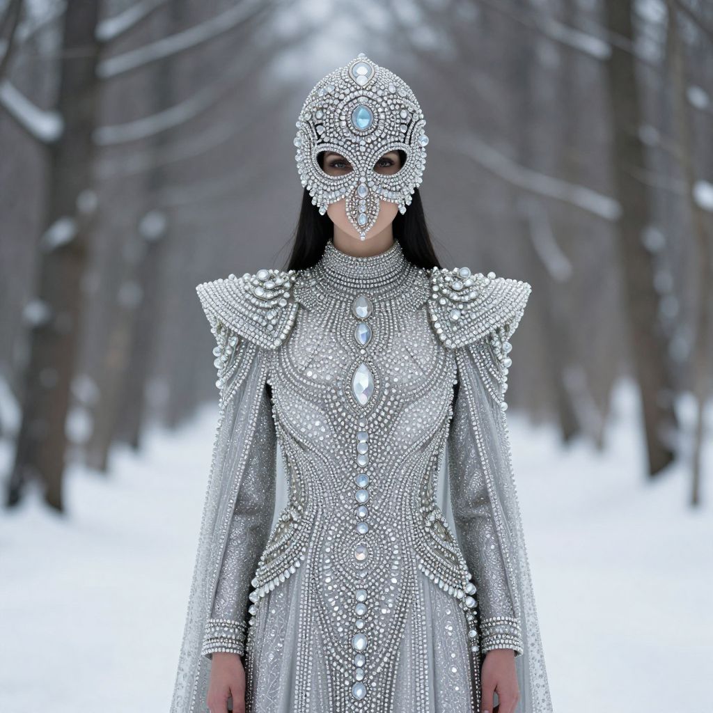 In the heart of a bustling New York City street, a figure stands out with an intricate and luxurious dragon-themed outfit. The dragon's scales, crafted from a blend of blue and gold, shimmer under the city lights. The headpiece, adorned with fine Swarovski crystals, rises majestically above, casting a regal aura. The dragon's face is hidden behind a crystal mandala ski mask, adding an air of mystery. The dragon's body is clad in a fitted kimono, richly decorated with floral patterns in shades of blue, green, and gold. The kimono's texture contrasts with the smooth, crystalline elements of the mask and headpiece, creating a visually striking ensemble. The figure's stance, slightly angled towards the camera, exudes confidence and elegance, as if ready to take on any challenge. The background, a blur of urban life, frames the dragon-like figure, emphasizing its prominence in the scene. The interplay of colors, textures, and shapes in this image paints a vivid picture of a character steeped in luxury and mystery, set against the backdrop of a vibrant cityscape.