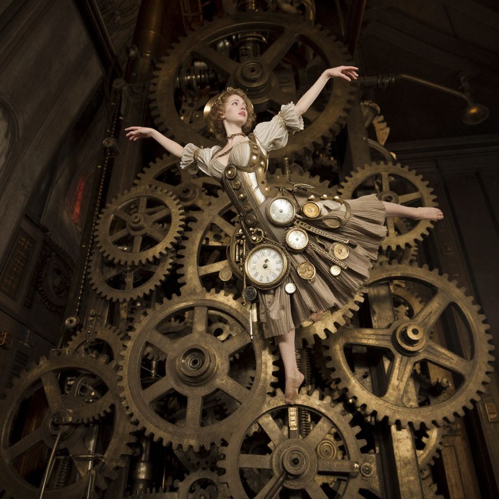 Craft an image in the neo-Victorian steampunk aesthetic, portraying a delicate woman with clockwork elements intricately fused into her form as she performs a graceful maneuver atop a colossal assembly of gears and cogs. The perspective should be from below, capturing her fluid motions amidst the complex machinery, creating an atmosphere of awe intertwined with apprehension. This scene contrasts human finesse with mechanical might, illustrating their harmonious blend in a fantastical fusion of historical accuracy and technological advancement.