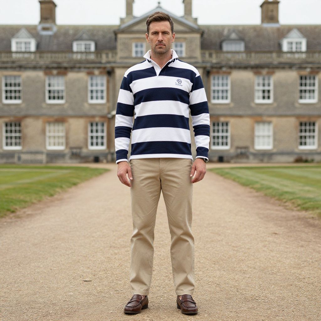 A man, heritage wear rugby shirt in navy and white stripes, beige chinos, brown leather loafers, casual yet polished look, historic barracks, oversaturated film, confident expression Man has masculine face and piercing eyes
