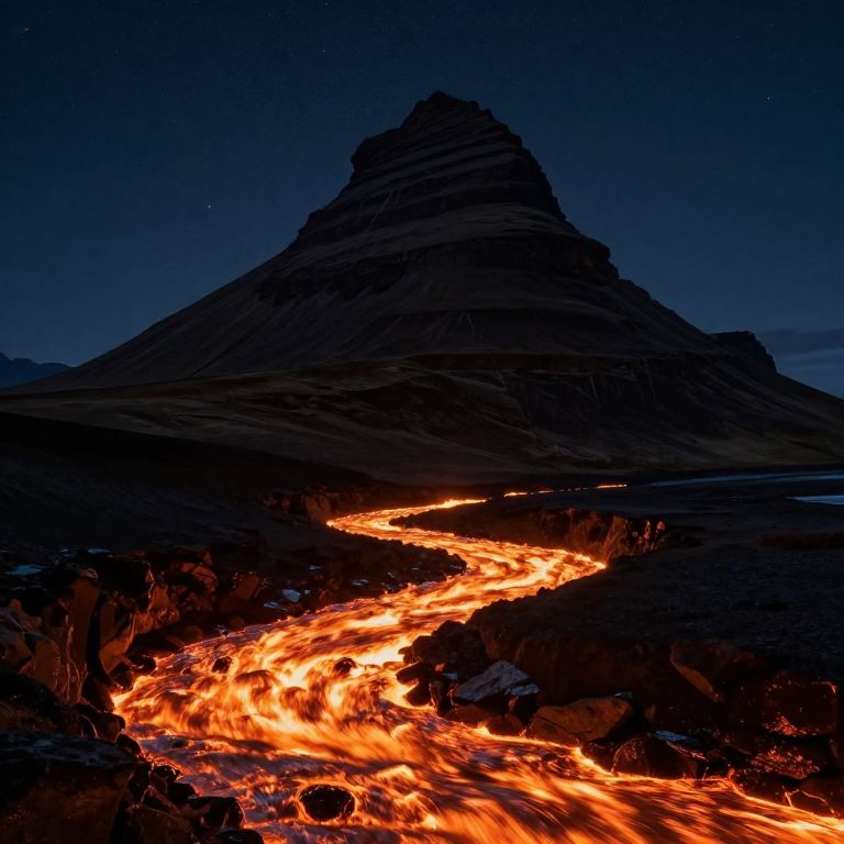 A majestic mountain stands silhouetted against a starlit sky, its base cradling a winding river of molten copper that glows like liquid fire, defying the laws of nature in this surreal, otherworldly landscape.