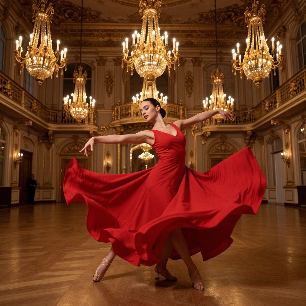 Photograph of a graceful ballerina in a flowing red dress, dancing in an opulent, chandelier-lit ballroom with ornate details