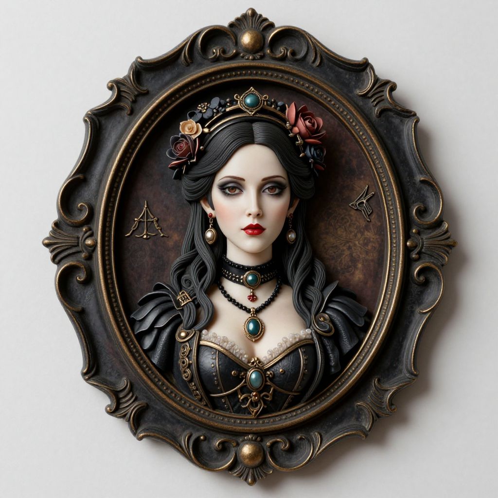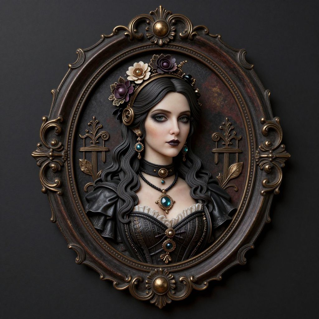 A meticulously crafted Gothic Steampunk \"Lady\" cameo wall plaque, featuring a 3D-rendered portrait of a woman adorned with intricate jewelry, including a black choker, a pendant necklace, and a floral headpiece, set against a dark, ornate frame with vintage-inspired detailing.