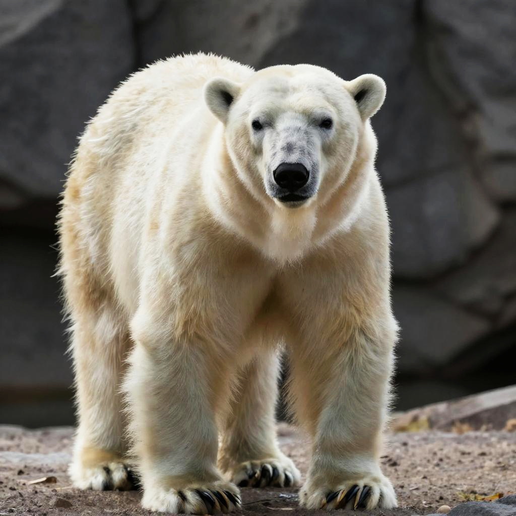 Photograph of a large, white polar bear standing on a rocky, textured ground. The bear has thick, fluffy fur, dark nose, and black eyes, with slightly drooping ears. Its powerful legs and large paws are visible, with claws slightly retracted. The background is blurred, featuring dark, rugged rocks, emphasizing the bear as the focal point. The lighting highlights the bear's fur, creating a contrast against the darker background. The bear appears to be looking directly at the camera with a calm, slightly curious expression.