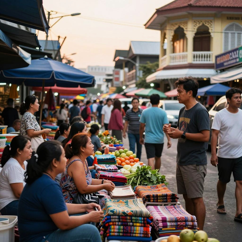 Documental style depiction of urban street market at dawn, bustling crowds, vibrant stalls filled with fruits and textiles, ambient atmospheric lighting, focus on cultural diversity and daily human interactions.