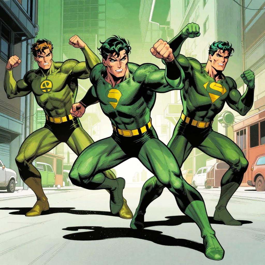 Male green characters as comic book superheroes, bold outlines, dynamic action poses, urban background with dramatic shadows, iconic costumes, vivid green hues, energetic composition
