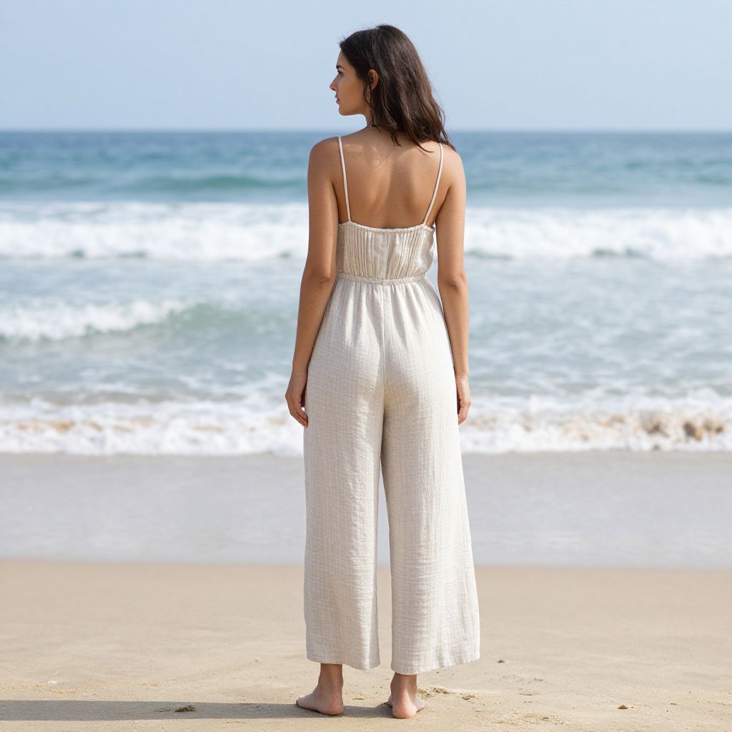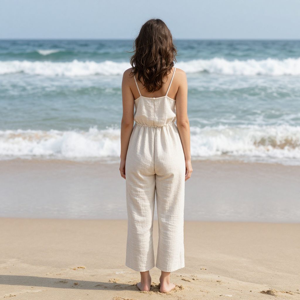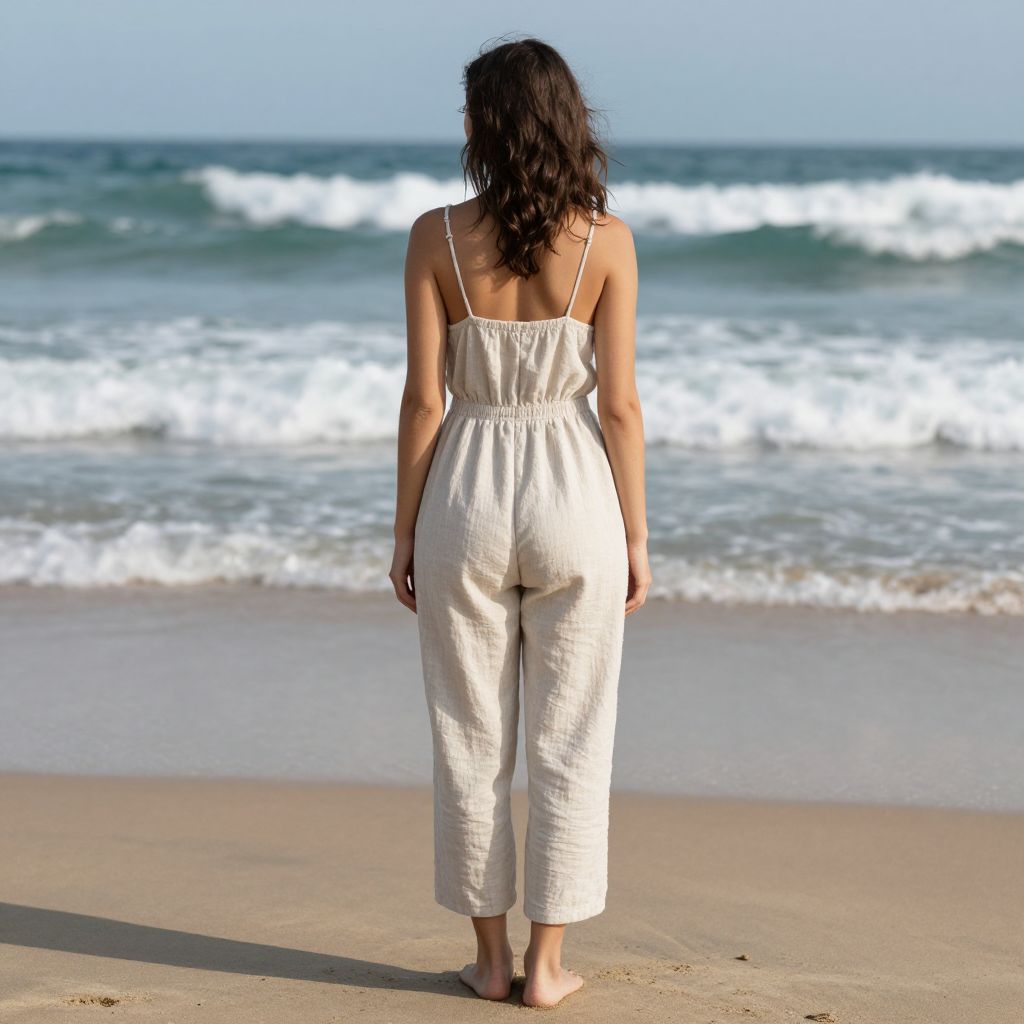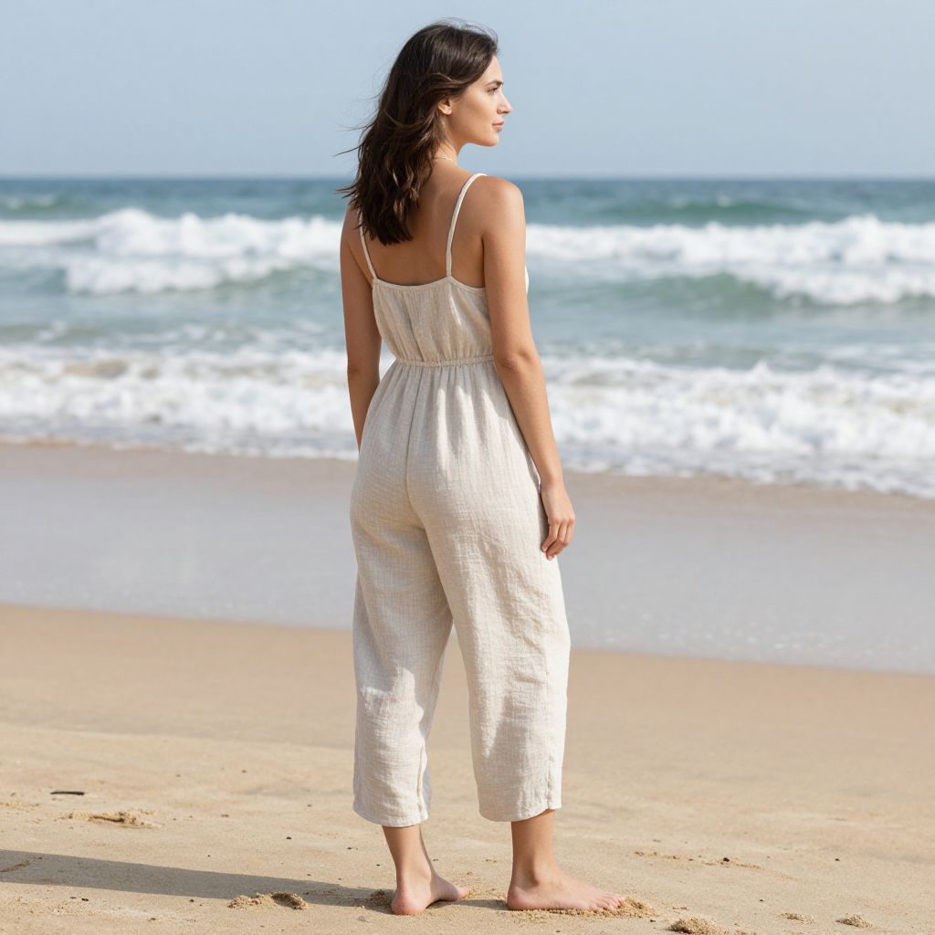Woman standing barefoot on a sandy beach, gazing at the ocean waves while wearing a stylish double gauze overall in a soft, neutral tone.
