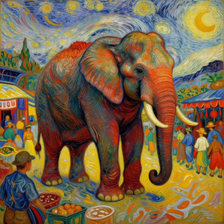 Envision an oil painting with photorealistic qualities that embodies Vincent van Gogh's signature swirling brushstrokes and vivid color palette in a novel composition. At the heart of a lively marketplace stands an imposing elephant whose form becomes one with the landscape through a distorted perspective. The elephant's textured surface, a harmonious blend of deep earthy hues, seamlessly transitions into the warm reds, oranges, and yellows that define the vibrant stalls and bustling crowd surrounding it. As the scene progresses from foreground to background, it creates an emotional spectrum of warmth and energy, capturing both the gentle might of the majestic creature and the pulsating life of the market, all while embracing van Gogh's timeless artistic approach and technique.
