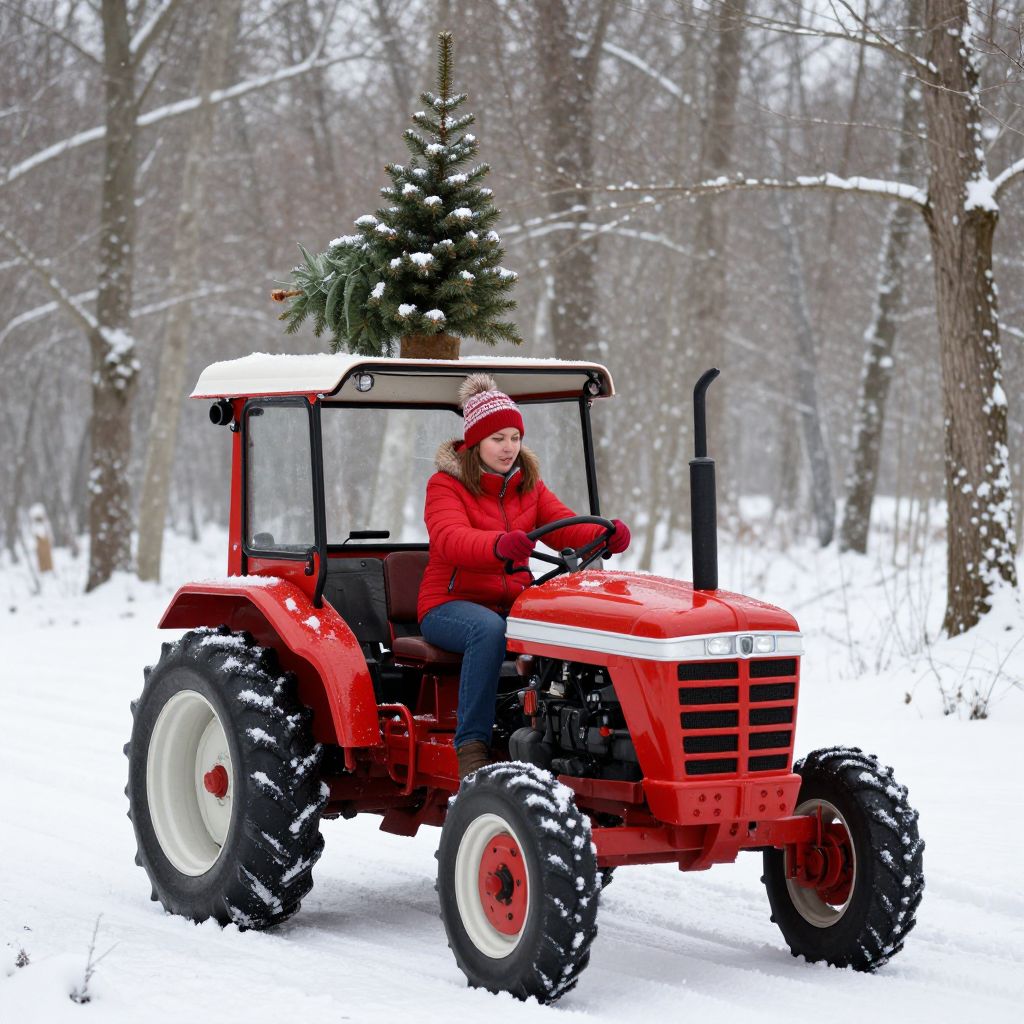 Jolly winter scene featuring a woman dressed in a red puffer jacket and hat, driving a classic red tractor through a snowy forest, with a small Christmas tree perched atop the vehicle's roof.