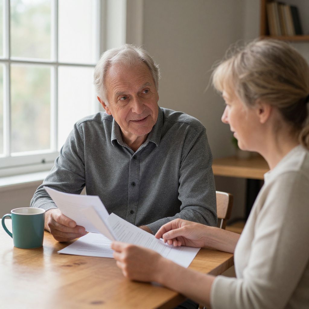 Senior man and woman engage in a warm conversation over documents and a teal mug, seated at a wooden table near a window with natural light streaming through.