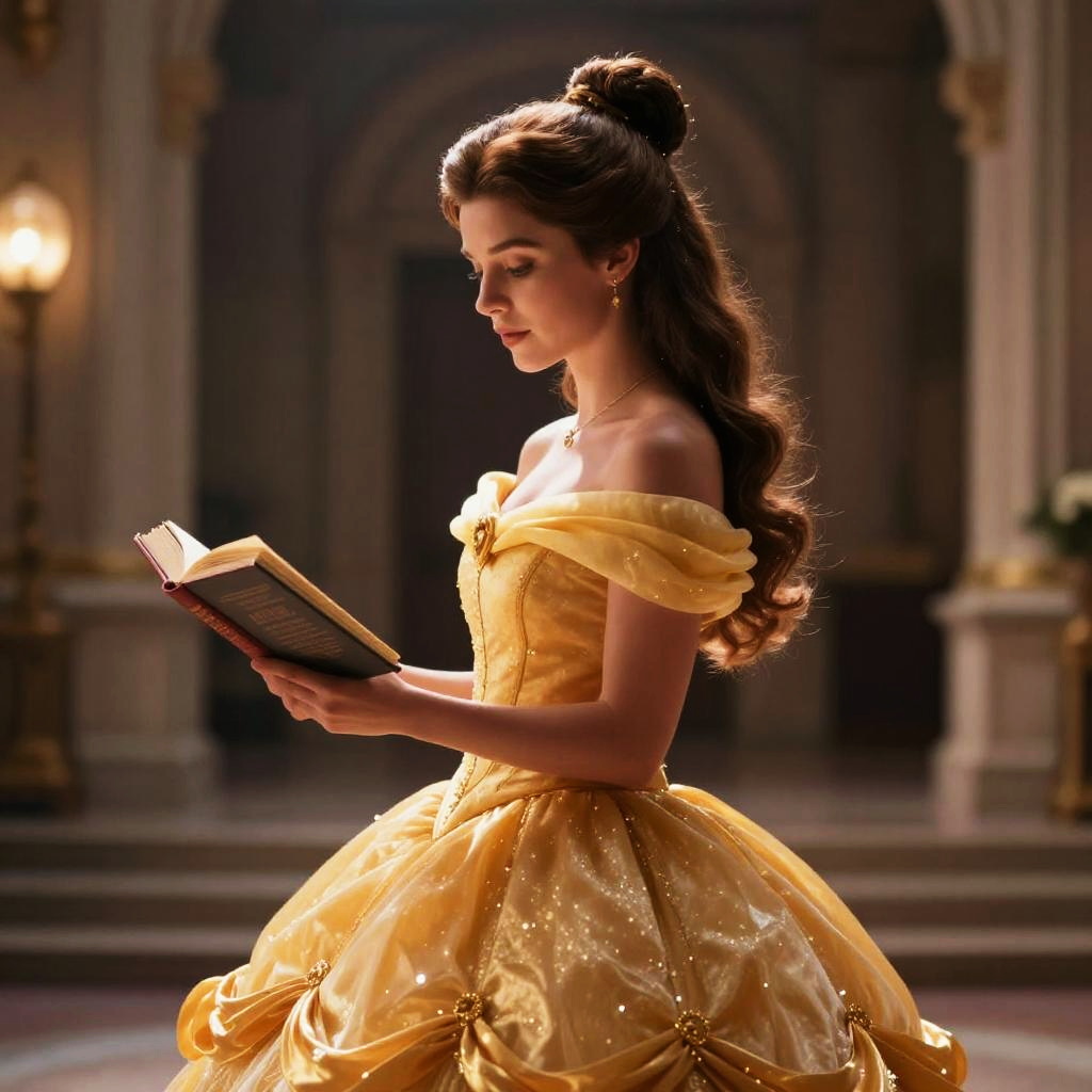 Cinematic film still Princess Belle with book, . shallow depth of field, vignette, highly detailed, high budget, bokeh, cinemascope, moody, epic, gorgeous, film grain, grainy