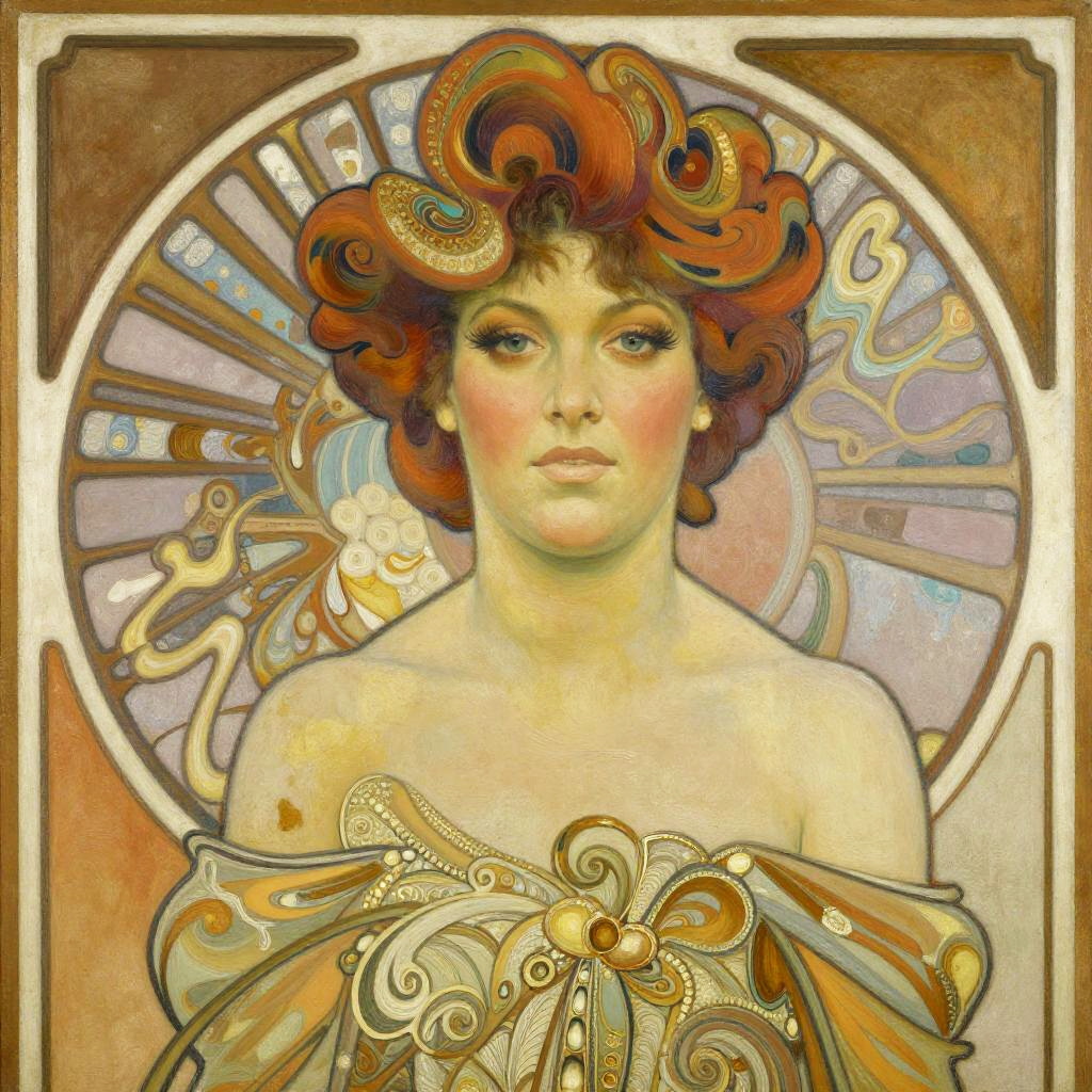 Digital artwork of a female figure with an emerald green braided crown and long hair cascading down. She wears intricate pearl drop earrings and a decorated off-shoulder dress against a golden, art deco inspired background reminiscent of Gustav Klimt's style.