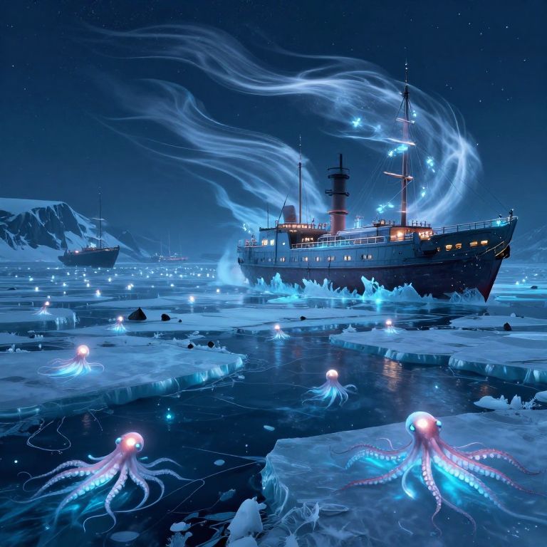 Beneath the Arctic ice, a city of luminescent octopuses negotiates peace with ancient ships animated by whispering wind.