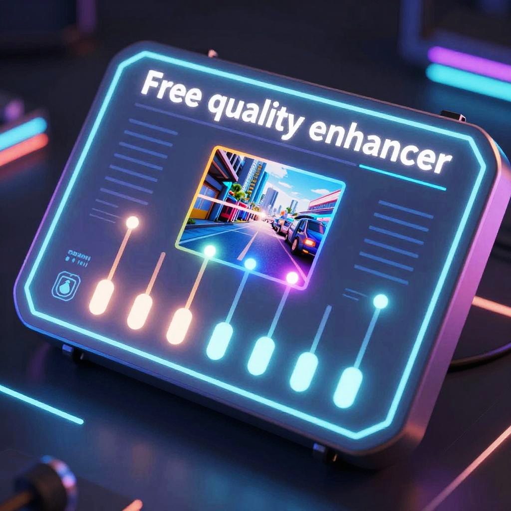 Free quality enhancer tool depicted as a futuristic digital interface with holographic controls and glowing sliders, enhancing image clarity and sharpness in a sleek cyberpunk style, vibrant neon colors, detailed and sharp visuals.