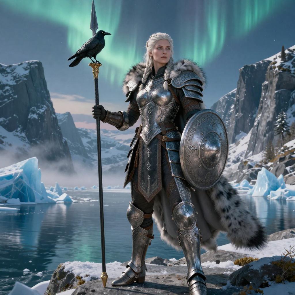Modelshoot style, (extremely detailed CG unity 8k wallpaper), full body shot of Valkyrie shieldmaiden goddess — full body, rune-etched iron and fur armor, braided platinum hair, wolf-pelt cloak, holding a raven-topped spear and round shield, fierce yet serene expression, aurora-lit glacial fjord at twilight with towering ice cliffs and mist over still cold water, professional majestic oil painting by Soren Valheim and Mira Haldor, Studio Ghibli, trending on ArtStation and CGSociety, intricate, high detail, sharp focus, cinematic lighting, photorealistic art by midjourney and Greg Rutkowski