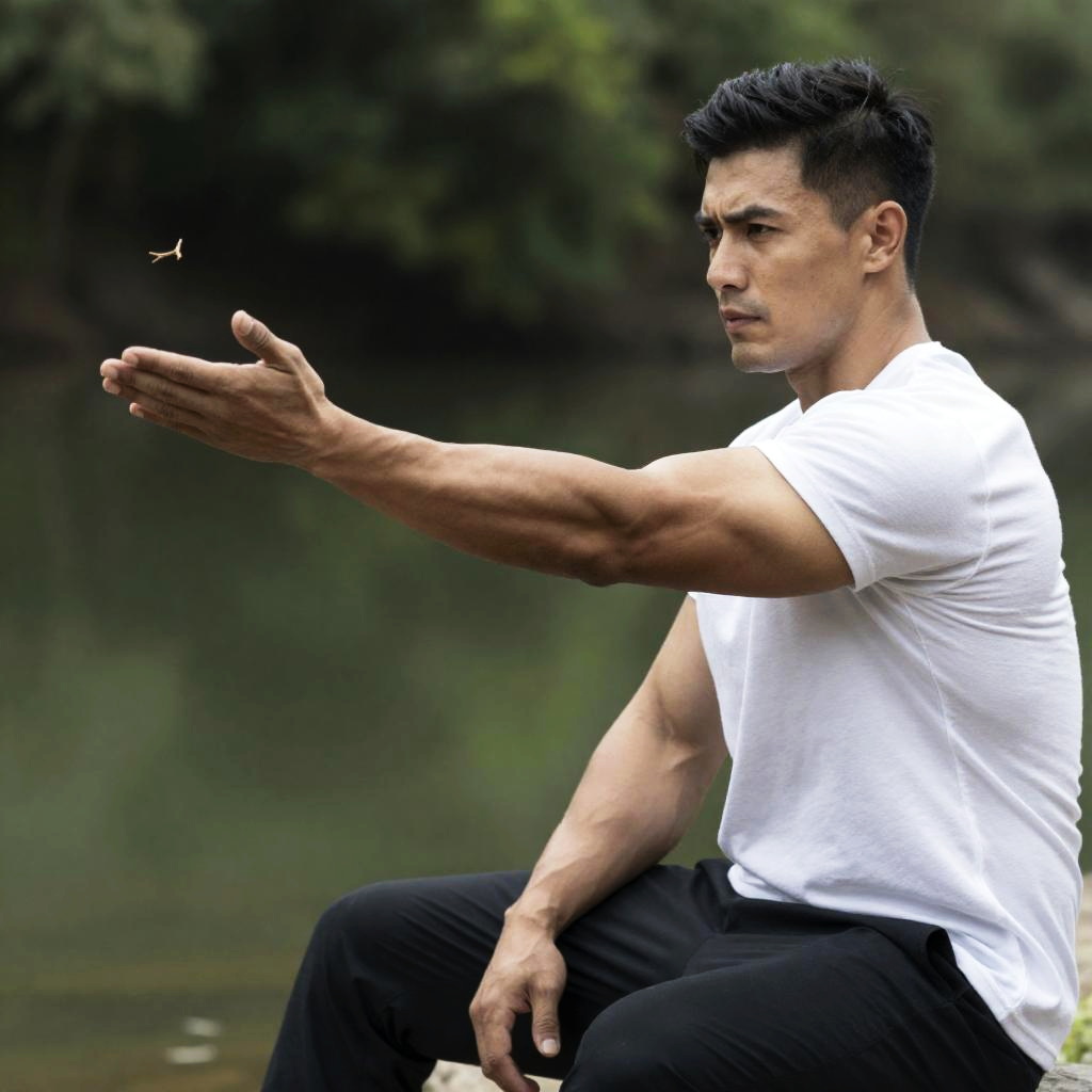 Photograph of a muscular man with short dark hair, wearing a white t-shirt and black pants, sitting by a lake. He extends his right arm forward, mid-motion, with a small twig flying near his hand. Background shows blurry green trees and water. His intense gaze is directed at the twig.