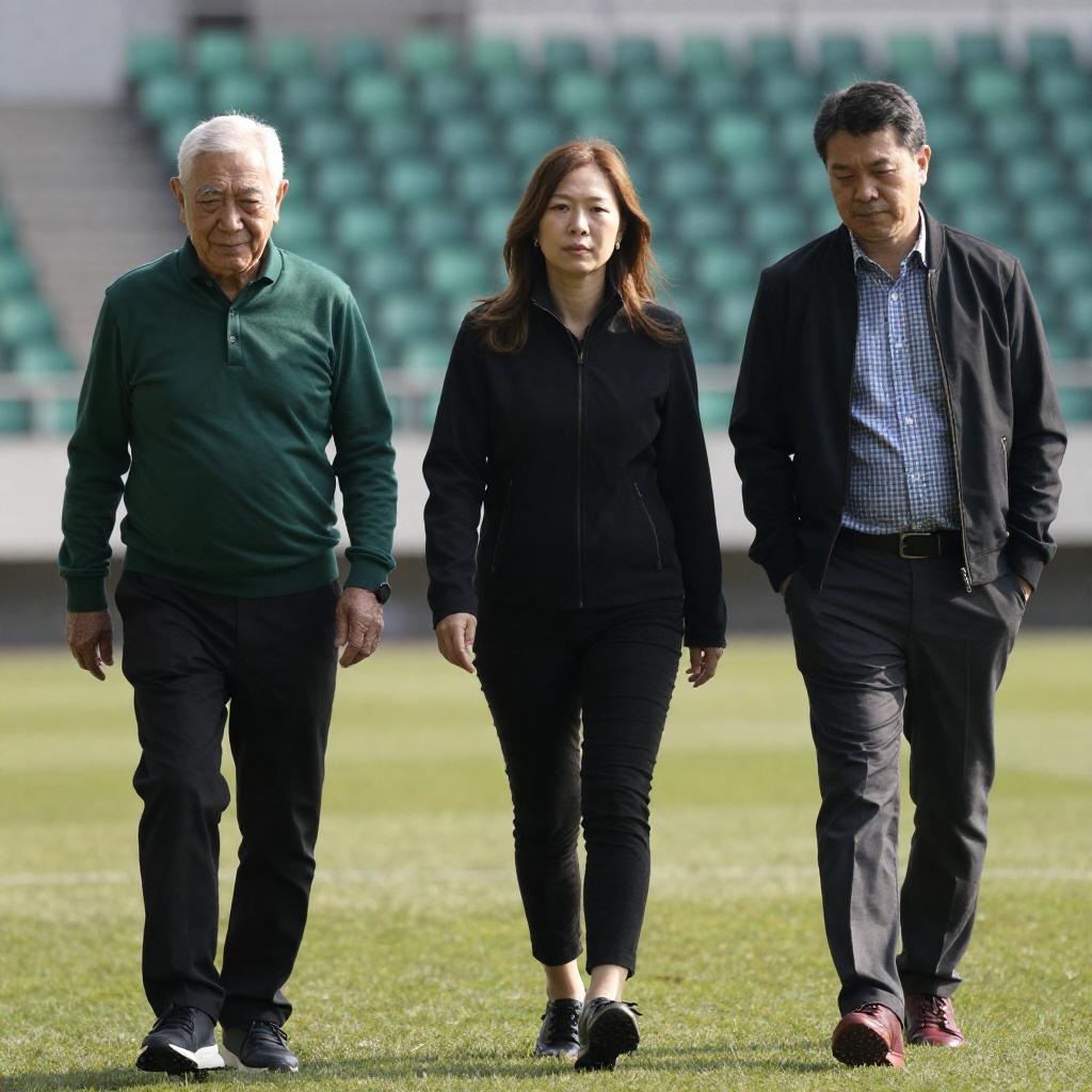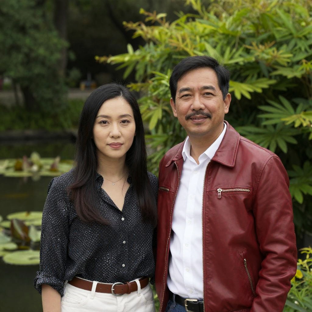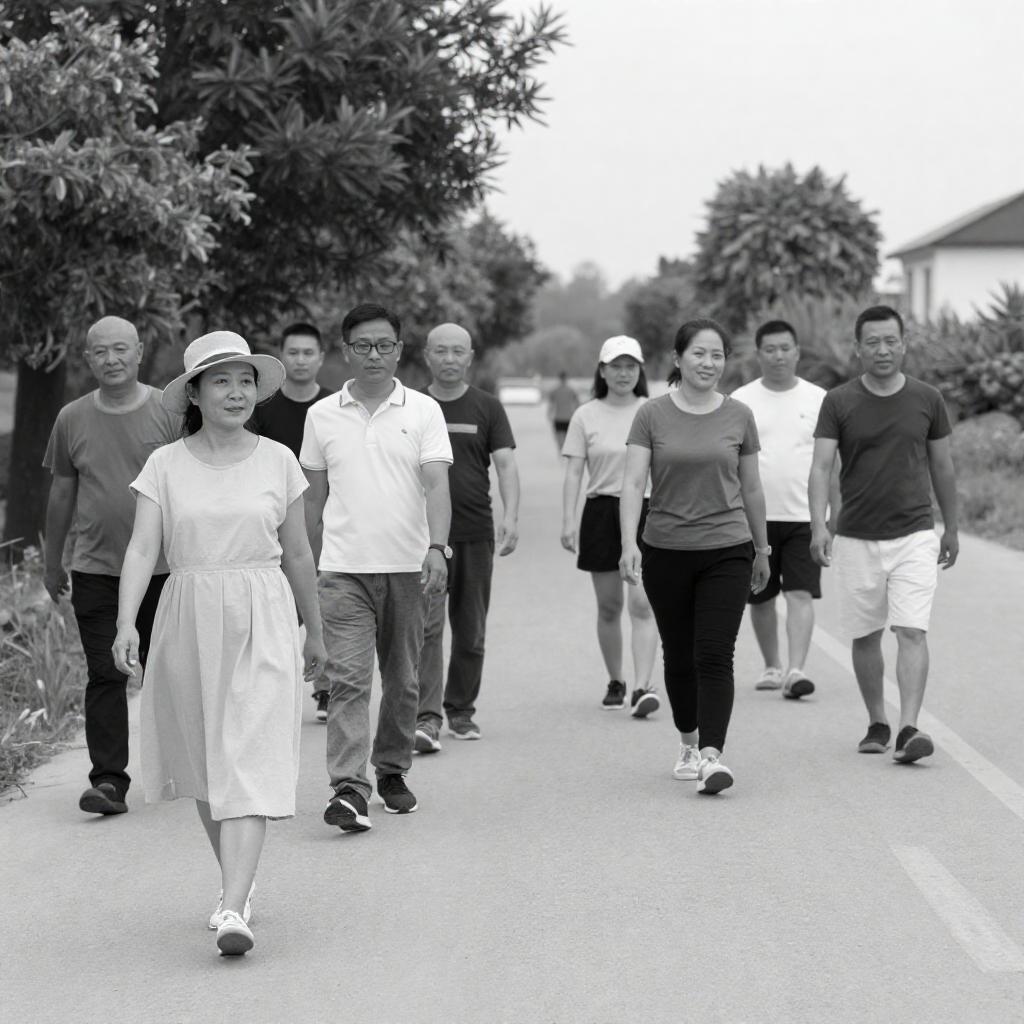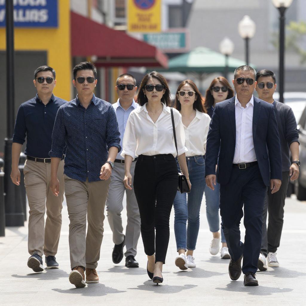 Photograph of six diverse adults walking down a city street. Central woman in pink sari, flanked by men in casual clothing. Woman on right in colorful dress, black boots. Urban background, buildings, street signs, trees. Casual, relaxed expressions. Group formation, walking together. Green fire hydrant on left, red sign on building. Overcast lighting.