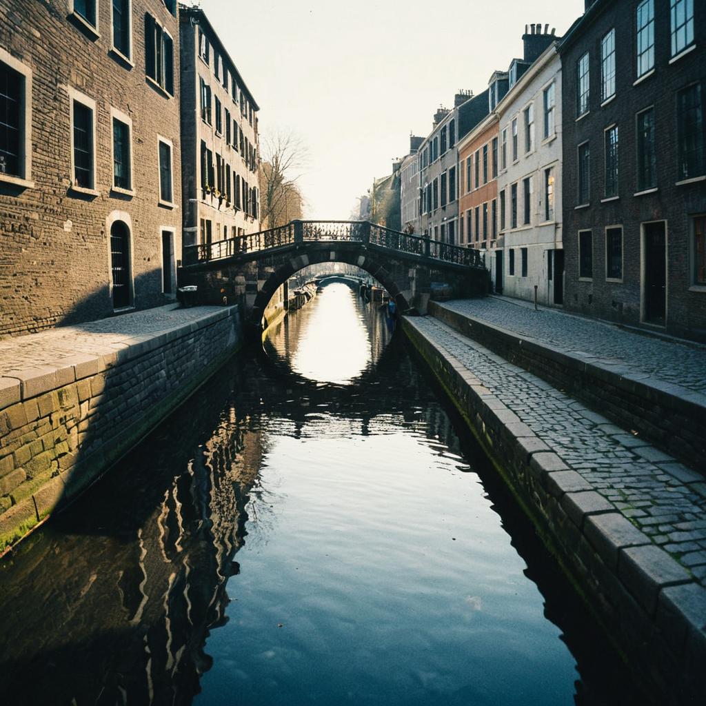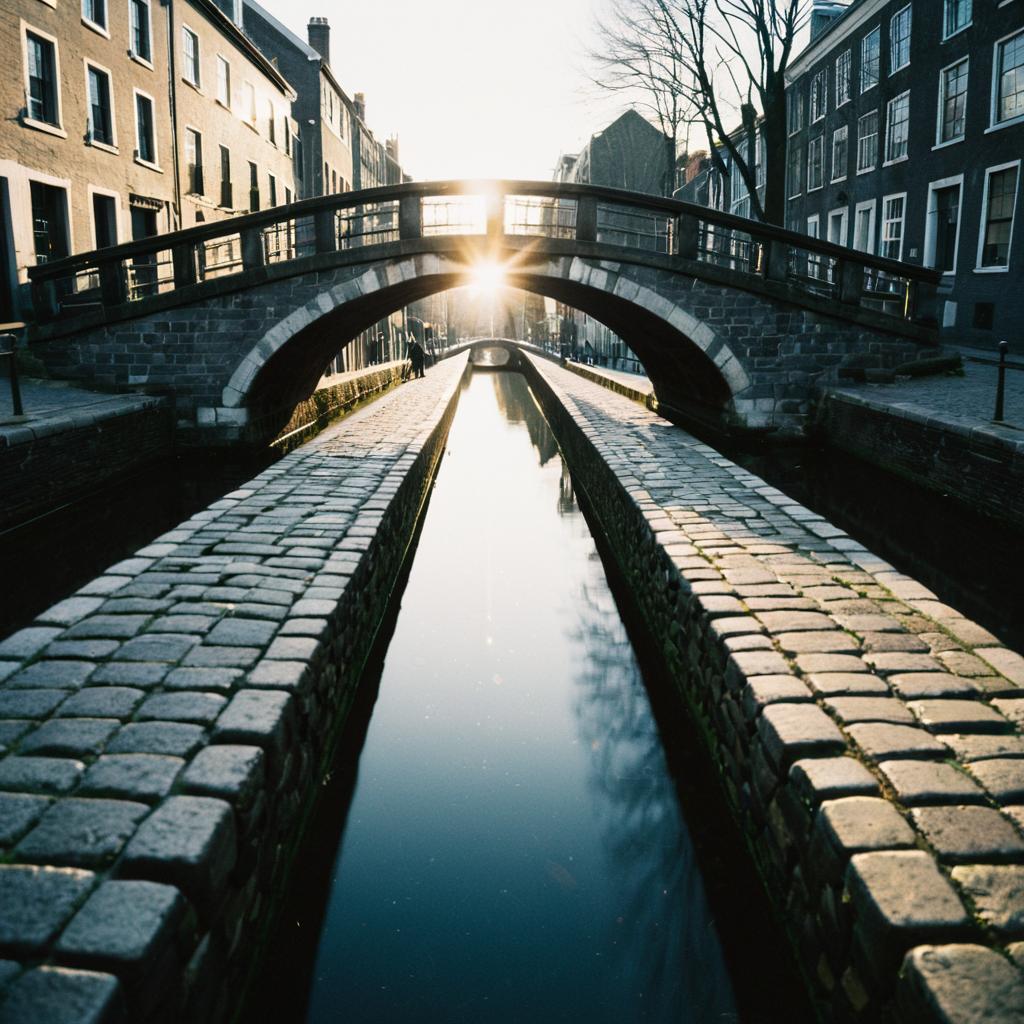 Still photograph of a narrow cobblestone bridge over a canal, capturing a sense of calmness, timelessness. The passive camera shot uses a wide-angle lens and slow shutter speed to emphasize the moment, featuring refracted lens flare and subtle post-processing techniques.