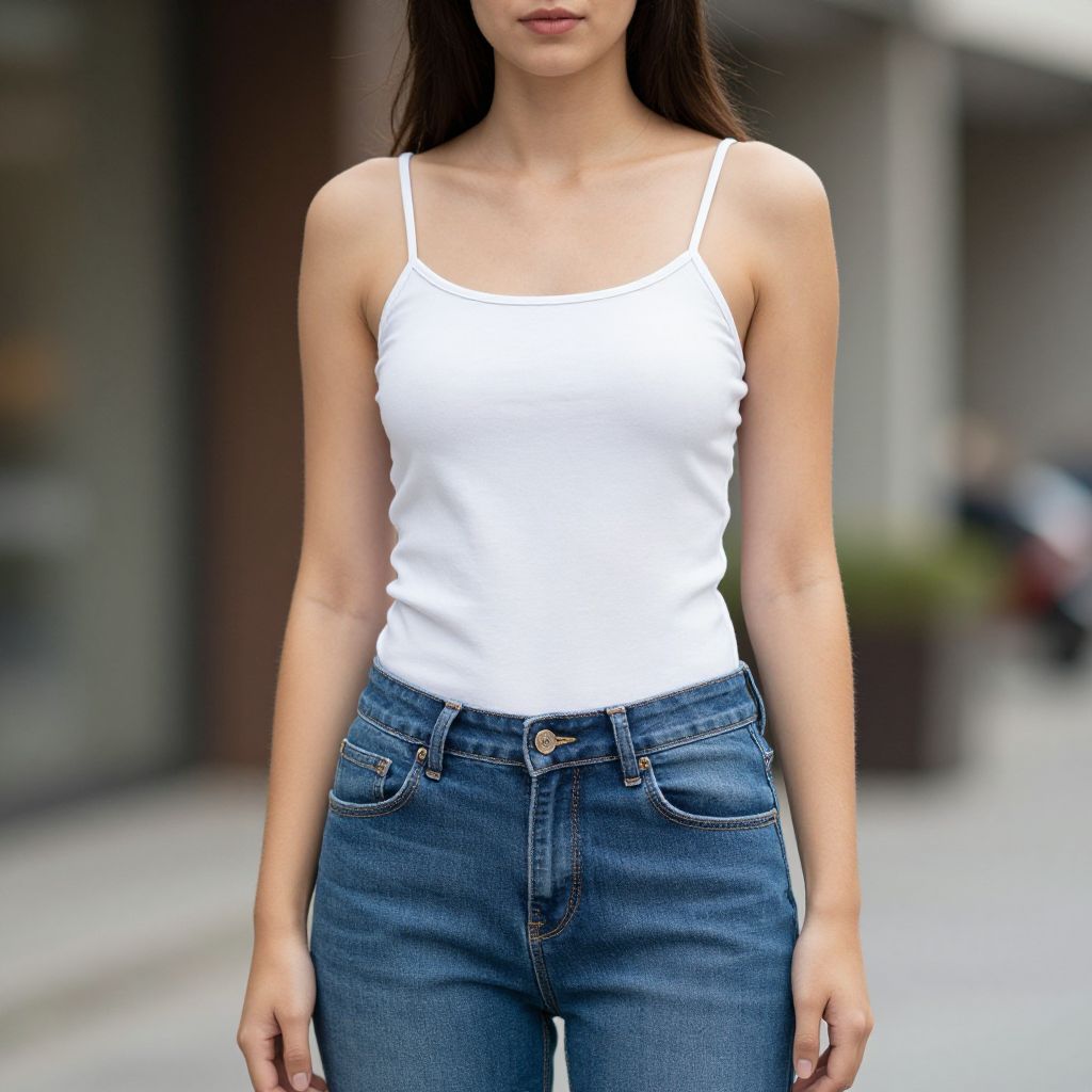 Photograph of a slender woman with long, straight dark brown hair, wearing a white, fitted spaghetti-strap tank top and high-waisted, dark blue denim jeans. Her skin is fair, and she has a neutral expression. The background is slightly blurred, showing an urban setting with a building and some greenery. The image focuses on her torso and jeans, highlighting the casual, minimalist style. The tank top contrasts sharply with the blue jeans, emphasizing her slim physique. The lighting is natural, suggesting an outdoor setting.
