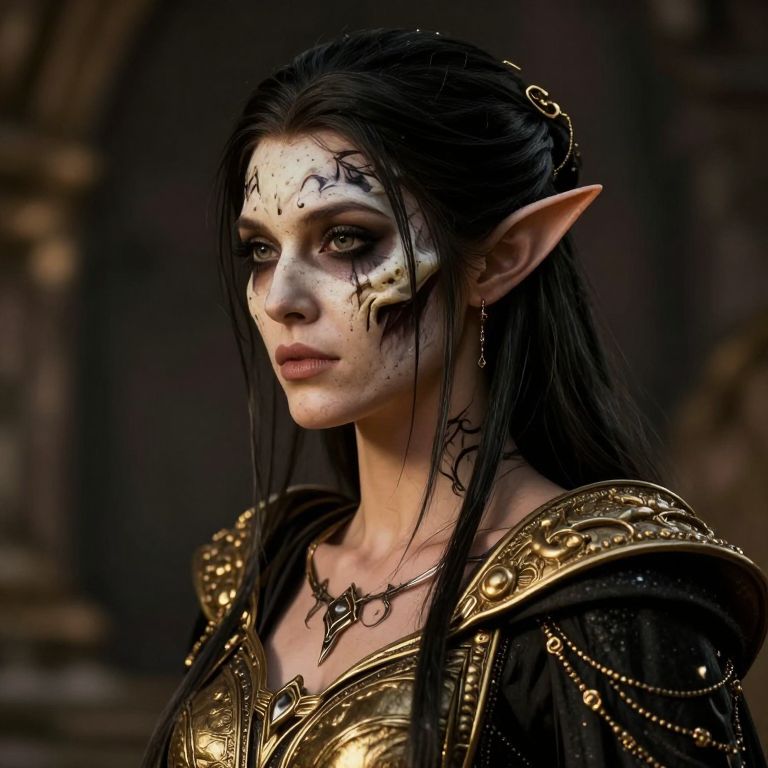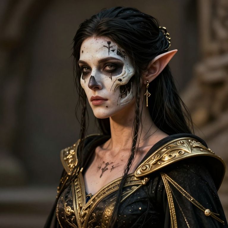 Elven girl, a stunning photo of a gorgeous necromancer female Aerenal Elf, gold and black robes, face warpaint, skull face paint, 8k HD, detailed skin texture, textured skin, maximum ultra high definition image quality and rendering, maximum realistic render, ultra realist style), realist side lighting, realist soft lighting, amazing special effect