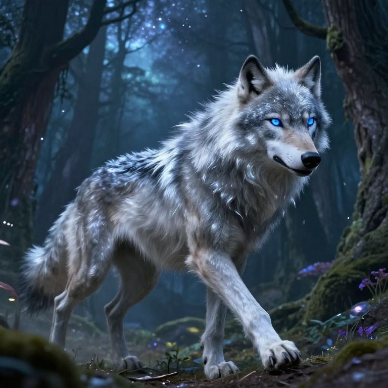 A digital artwork of a majestic, blue-eyed wolf with silver-gray fur and white accents, standing in a mystical, dark forest. The wolf's fur is detailed with individual strands, glowing slightly in the dim light. Its piercing blue eyes stand out against the dark blue and purple hues of the forest background, which includes blurred trees, moss, and tiny glowing fireflies. The wolf is in mid-stride, with its right front leg extended forward. The forest floor is covered in moss and small, colorful flowers, adding a touch of vibrancy to the scene. The overall atmosphere is magical and enchanting.