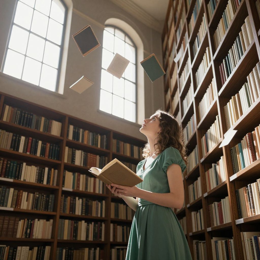 Books float gracefully through the air in a towering library, illuminated by soft sunlight streaming through high windows, as a woman in a green dress stands amidst the shelves, holding an open book and gazing upward in wonder.