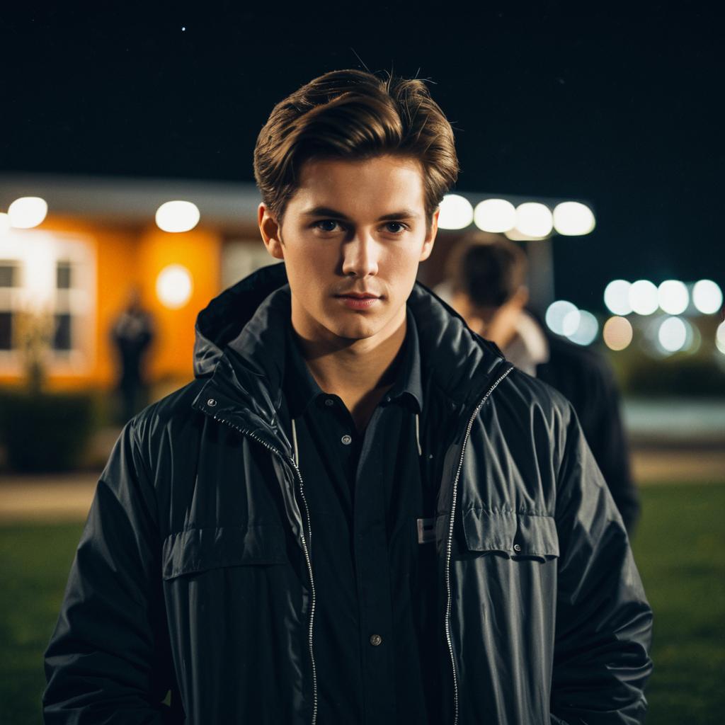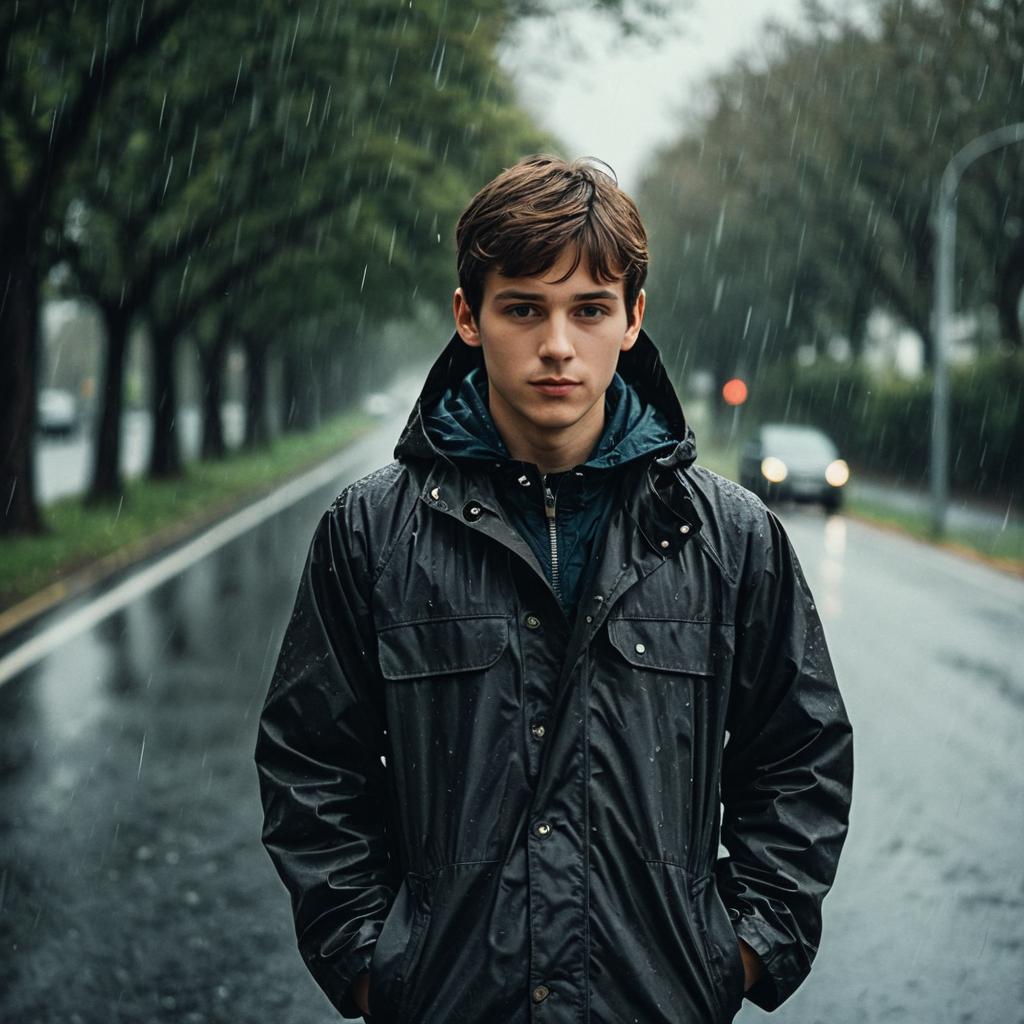 Portrait of a young man with brown hair wearing a black raincoat, standing outdoors on a wet road during rain. The background features blurred trees and a car with headlights on, creating a moody and realistic rainy atmosphere.
