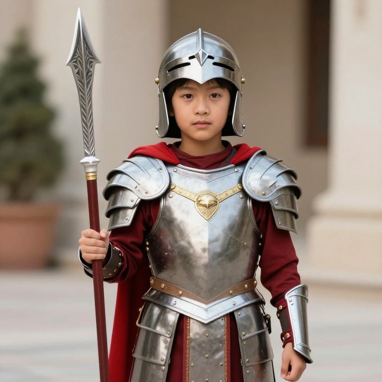 Photograph of a young Asian boy standing outdoors, dressed in medieval-style silver armor with a red cape draped over his shoulders. He wears a polished steel helmet and holds a tall, ornate spear in his right hand. His expression is neutral, and he gazes directly at the camera. The background is slightly blurred, featuring a beige building with columns and a potted plant. The armor includes shoulder pauldrons, a chest plate with a golden emblem, and a skirt-like lower armor piece with a red lining. The overall scene conveys a mix of historical and fantasy elements.