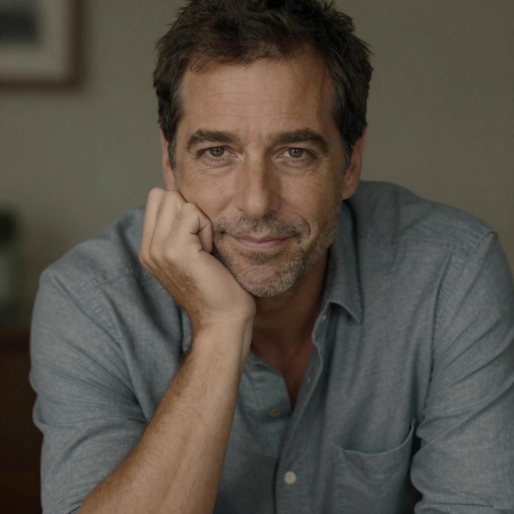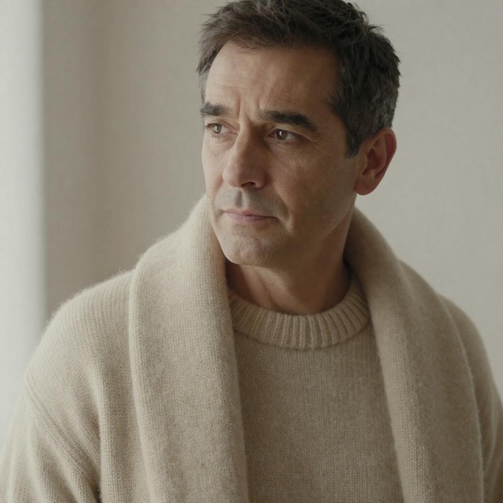 Photograph of a middle-aged man with short dark brown hair, slightly rugged features, and light skin. He wears a thick, beige, knitted sweater with large, chunky yarn details, draped over his shoulders. He gazes slightly to the left with a neutral expression. Soft, natural light in the background. Upper body close-up.